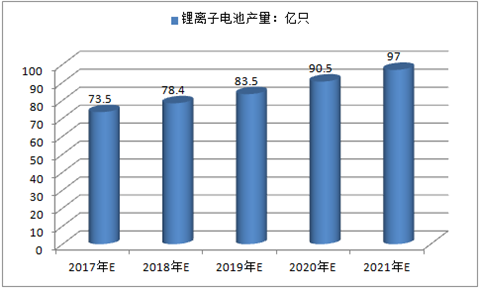 2015年,中國鋰離子電池產(chǎn)量為56.0億只,同比增長3.1%。;2016年1-9月,產(chǎn)量達(dá)到52.4億只,同比增長32.8%。預(yù)計2017年中國鋰離子電池產(chǎn)量將達(dá)到73.5億只,未來五年(2017-2021)年均復(fù)合增長率約為7.17%,2021年中國鋰離子電池產(chǎn)量將達(dá)到97.0億只。